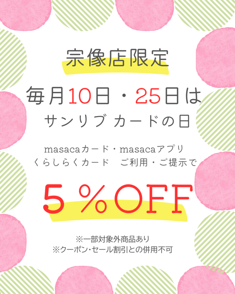 宗像店限定のお得なお知らせです 毎月10日&25日はサンリブカードの日 レジにてmasacaカード、masacaアプリ、 くらしらくカードのどれかを ご利用またはご提示(バーコード読取)で 店内商品のほとんどが5%OFFになります。 生地や毛糸、洋裁道具やビーズなど さまざまな商品が5%OFF! 毎月10日と25日は ぜひサンリブくりえいと宗像へお越しください♪ ※特価品・書籍・リバティ生地など 一部対象外がございます。