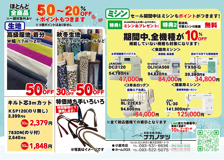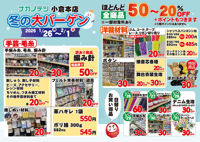 ❄️🧵 【1/26(月)〜2/1(日)までナカノテツ小倉本店で冬の大バーゲン開催!】 🧵❄️ \ほとんど全商品 50%〜20%OFF!/ ※一部対象外あり さらに✨ポイントもつきます✨(※5倍ポイントはありません) 🧶 手芸・毛糸 手編み糸・毛糸・編み針、フェルト羊毛、刺しゅう材料など ➡︎ 20%〜30%OFF 訳あり編み針はなんと50%OFF!(現品限り) 👗 生地 高級服地着分、秋冬生地、キルト芯など ➡︎ 30%〜50%OFF その他の生地も20%OFF~! 特価持ち手も特別価格にて販売いたします! ✂️ 洋裁材料 ゴム・コード・テープ・レース・リボン切り売り、接着芯・ボタンなど ➡︎ 20%OFF〜 まとめ買いにもおすすめ✨ 🧵 ミシンもセール! 期間中 全機種 10%OFF ・30,000円以上お買い上げの方にミシン糸プレゼント ・不要ミシンの廃棄無料 家庭用ミシン、3本糸ロック、職業用ミシンなど、お得にゲットできるチャンス✨ 📅 日替りお買い得品も毎日登場! (1/26〜1/31) 冬の手づくり準備にぜひご利用ください⛄ ご来店お待ちしております♪