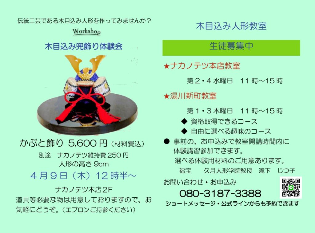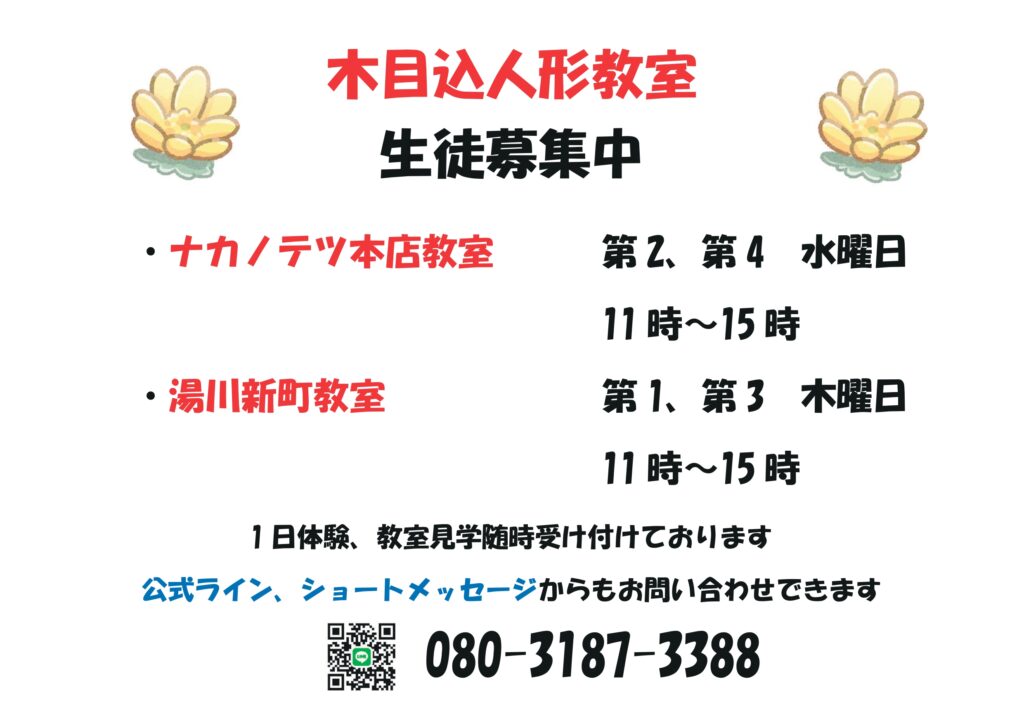 🌸伝統工芸に触れてみませんか?🌸 木目込み兜飾り体験会を開催します! 本格的な木目込み人形を、はじめての方でも楽しく作れる体験講習です✨ 兜飾りを手作りしてみませんか? 【体験講習】 🎏人形の高さ 約9cm 💰5,600円(材料費込) ※別途 ナカノテツ維持費250円 📅4月9日(木)12:30~ 📍ナカノテツ本店 2F 道具はすべてご用意しておりますので、 お気軽にご参加いただけます♪ (※エプロンをご持参ください) さらに!木目込み人形教室 生徒募集中! ・ナカノテツ本店教室 第2・第4 水曜日 11:00〜15:00 ・湯川新町教室 第1・第3 木曜日 11:00〜15:00 ✔ 資格取得できるコース ✔ 自由に楽しめる趣味コース 体験・見学も随時受付中です✨ 📩公式LINE・ショートメッセージからも お問い合わせいただけます 📞080-3187-3388![]()